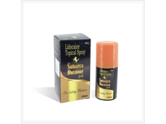 Suhagra Duralong Spray is a topical spray designed to help manage premature ejaculation by reducing sensitivity and prolonging performance. It contains a mild numbing agent that works quickly, helping improve control and enhance confidence when used as directed.